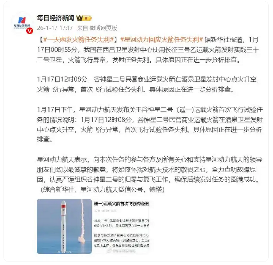 1月17日下午,星河动力航天发布关于谷神星二号(遥一)运载火箭首次飞行试验任务的情况说明:1月17日12时08分,谷神星二号民营商业运载火箭在酒泉卫星发射中心点火升空,火箭飞行异常,首次飞行试验任务失利。具体原因正在进一步分析排查。